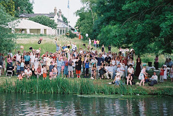 Time for Tea; The Bumps of 1906, Ditton Corner Painting by Percy Robert Craft; 6ft by 4ft; Cambridge Guildhall This painting was discovered last year in the Cambridge Guildhall and has now been restored. It shows the gardens of Ditton Corner crowded with spectators for the 1906 Bumps. Ditton Corner (house in the background) with crowds watching the bumps in 1910 This image can also be viewed in more detail Here's the same view in June 2000 Here's the group photo -same view - in June 2001 and whaddyaknow, we did it again - in June 2002 Getting pretty good at it by 2003 Bunch of hat-tossers in 2004 Another bunch of reprobates in 2005 Looks familiar? The gang from 2006 Brollies on the bank in 2007... With a tandem bicycle in 2008... Getting reflective in 2009