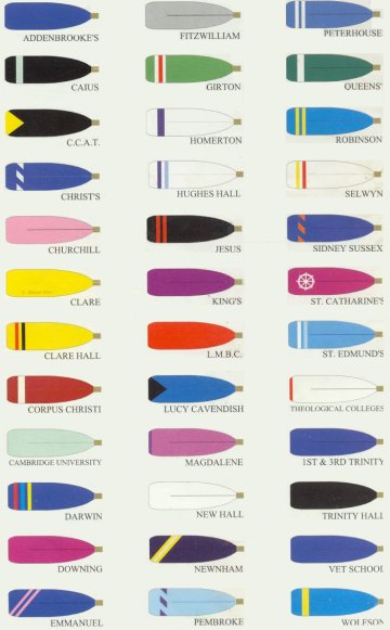 The four-day rowing races between the colleges of the University of Cambridge are known as Bumps and Carnage, and have been held twice a year since 1827. The May bumps, occur in June, naturally. Boats try to catch and hit or bump, the boat ahead. Boats row in divisions - 17 boats in a line a few yards apart, started by a gun. The race begins at the Gun Sheds, down the First Post Reach, round the Gut, round Ditton Corner and finishes down the Long Reach to Chesterton. The objective is to catch up with and bump the boat ahead before being bumped by the boat behind. The bumper then changes place with the bumped when the race is held again the next day. The Bumps are held four days running, beginning on Wednesday and the last day, Saturday, being a day of spectacle attended by large crowds of spectators along the river banks. More than 30 colleges and university affiliated departments take part in the bumps. Each has its own colours and can be recognised by the blades on their oars. A guide to recognising the boats is given below. It is possible for a good crew to advance four or more places up the division, in which case the crew wins its 'oar' - a prized possession. A crew that has won its oar will carry its college flag down the river - to the applause of the crowds. A crew that makes a bump traditionally signals this by decorating the boat and rowers with foliage for their row back down the river to the boat houses. About a third of the way down the course is the bend of Ditton Corner where the well-coxed crew can catch their quarry by cutting inside.